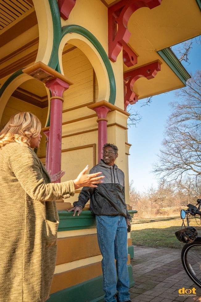 Mr. Richardson shares photos of his dogs with Baltimore City Department of Transportation Veronica P. McBeth. Photo: Benjamin Jancewicz