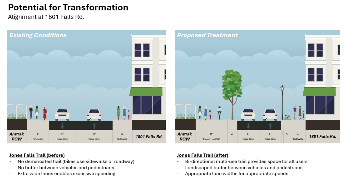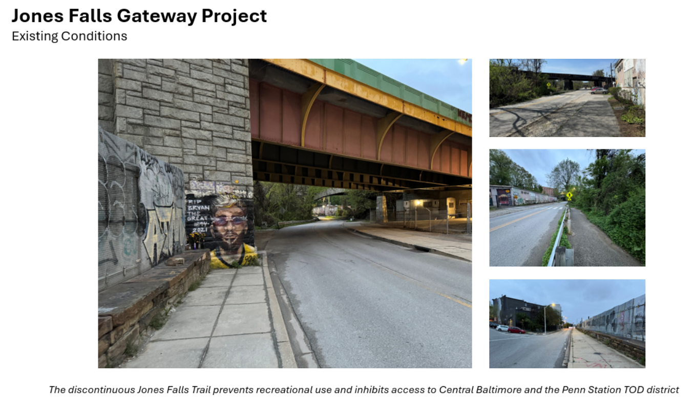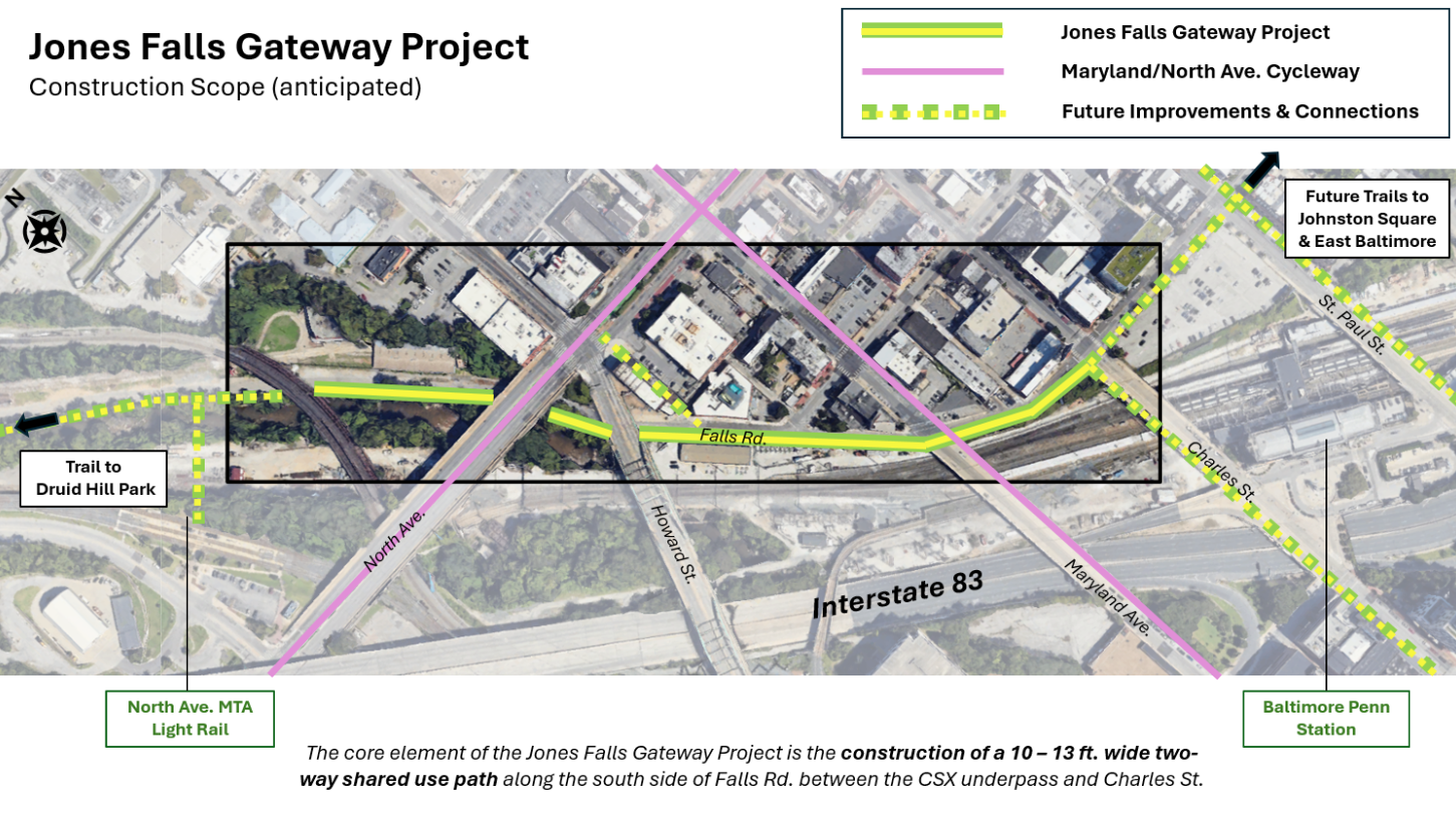 The Jones Falls Gateway Project seeks to transform a narrow, discontinuous sidewalk along the south side of Falls Road and Lanvale Street — between the CSX Bridge underpass (next to the Streetcar Museum) and Charles Street — into a 10–13' wide shared-use path suitable for people of all ages.