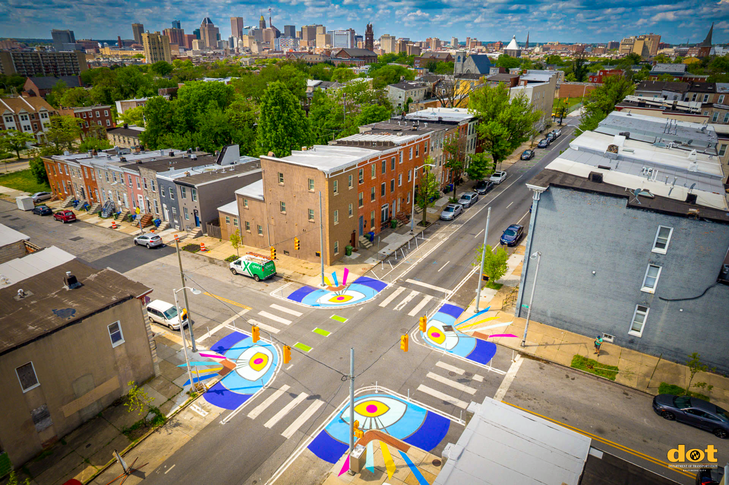 The Allover Eyes traffic calming mural helps East Baltimore’s Oliver neighborhood achieve its long standing goals of beautification and improving pedestrian safety at the historically dangerous intersection of Biddle and Bond Streets. Allover Eyes was created with the Oliver Action Team with support from ReBUILD Metro, the Oliver Community Association, and Baltimore City DOT. Graham Projects completed this project in April 2023.