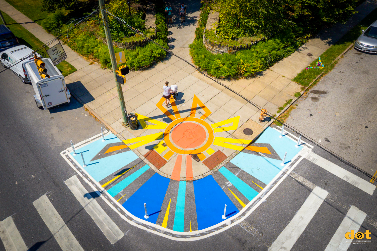 Initiated by the Highlandtown Community Association, the Park Shine traffic calming installation and pavement mural beautifies and improves pedestrian safety at the intersection of Eastern Avenue and Ellwood Street, a major entrance to Patterson Park. The Park Shine traffic calming art project was commissioned by the Highlandtown Community Association with support from a Public Art Across Maryland grant from the Maryland State Arts Council and a Community Safety Works grant from the Maryland Department of Housing and Community Development. The design was completed in September 2023, by Graham Projects.