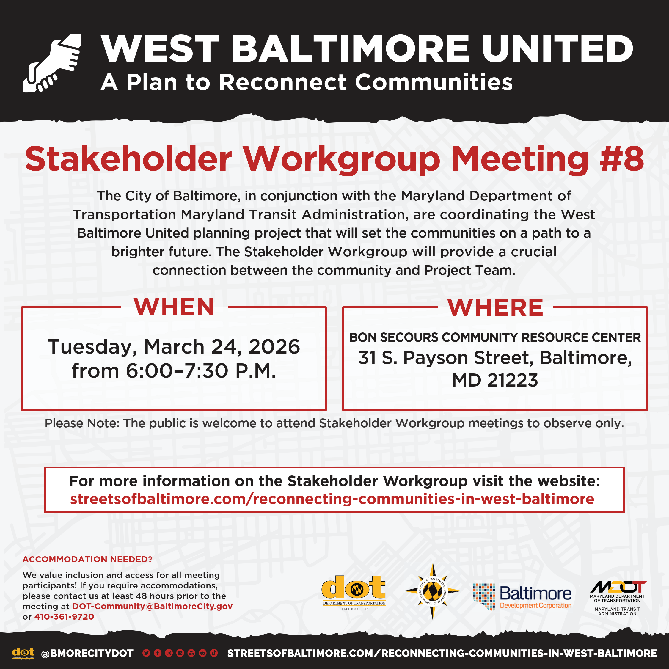 For questions or additional information about the Highway to Nowhere, the Reconnecting Communities Planning Study, or the federal grant funding, contact us at westbaltimoreunited@baltimorecity.gov.