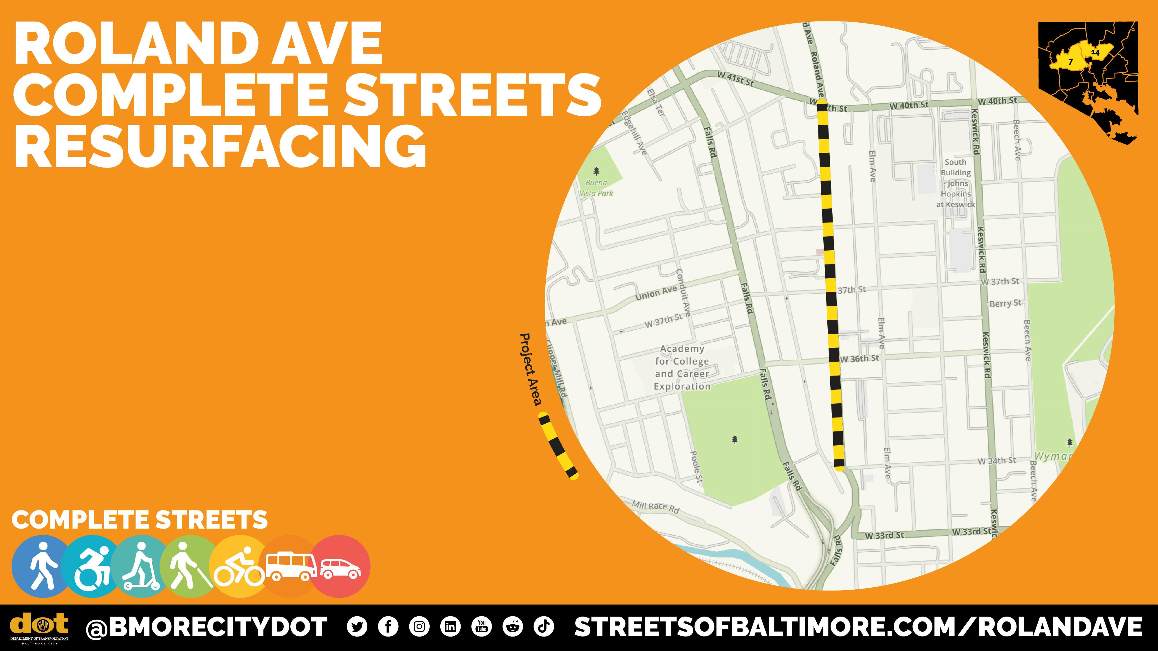 In addition to resurfacing the roadway, this corridor will receive Complete Streets treatments that support safer travel for all users like adding or refreshing crosswalks, narrowing travel lanes, and/or installing bump outs . Bicycle facilities along Roland Ave from 40th Street to 36th Street will also be improved in alignment with the Separated Bike Master Plan.