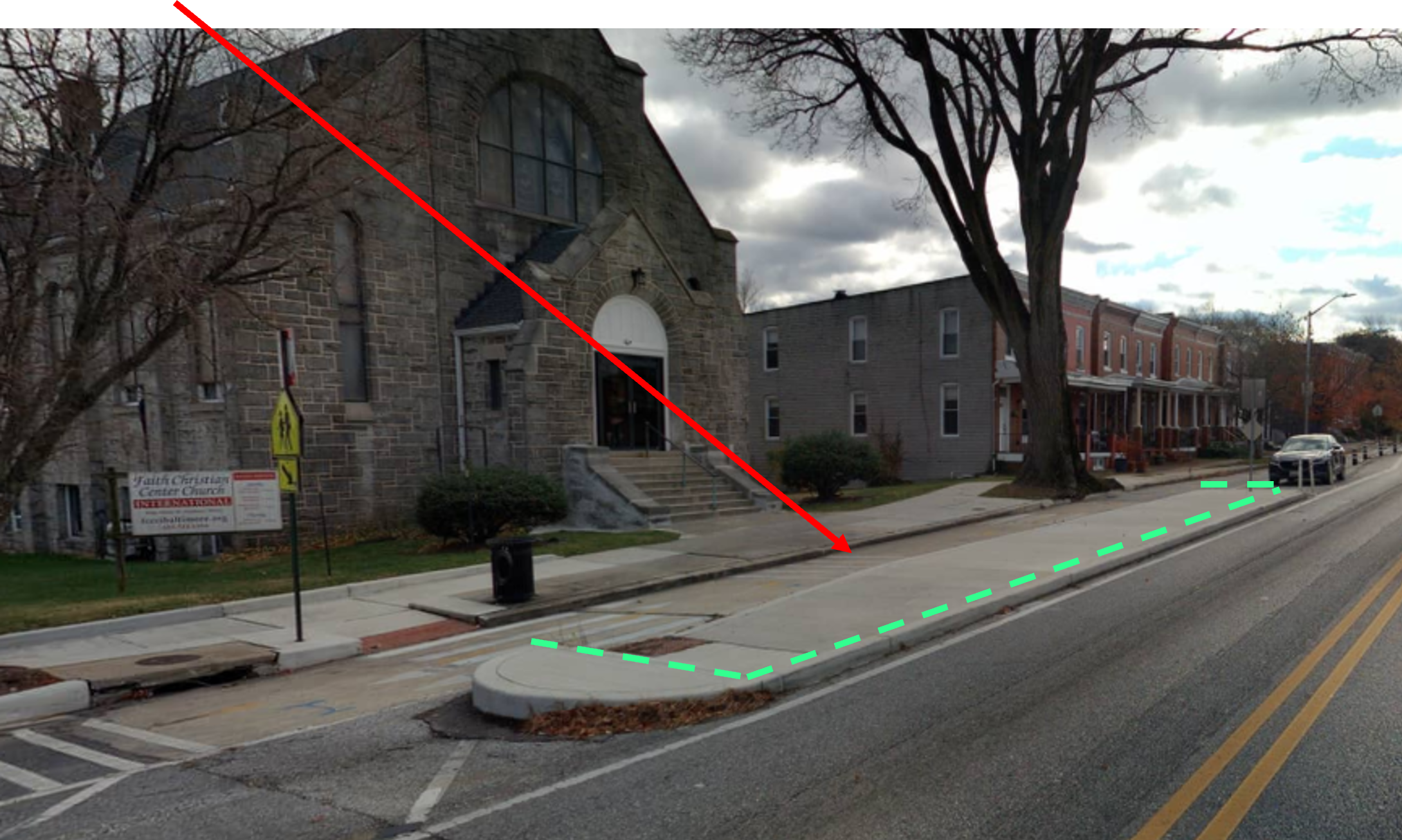Bus stops along the cycle track will also be upgraded with bus bulbs. These types of stops already exist throughout Baltimore City and provide level boarding access to users in addition to allowing the bus to keep in lane and reduce conflict points, leading to increased boarding time and safety. Below is an example form Harford Road and Kentucky Ave.