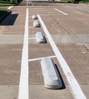 To make a safe and separated path for users of all ages and abilities to enjoy, Precast curbs, known as “pills", will be used in conjunction with flex post to create a separated barrier.