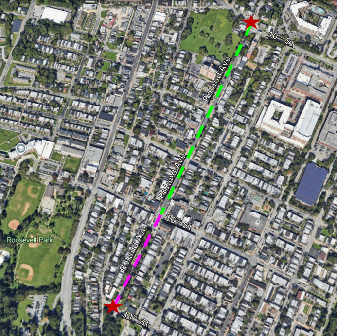 Roland Ave from 40th Street to 36th Street will be upgraded to any all ages and abilities separated bike facility.